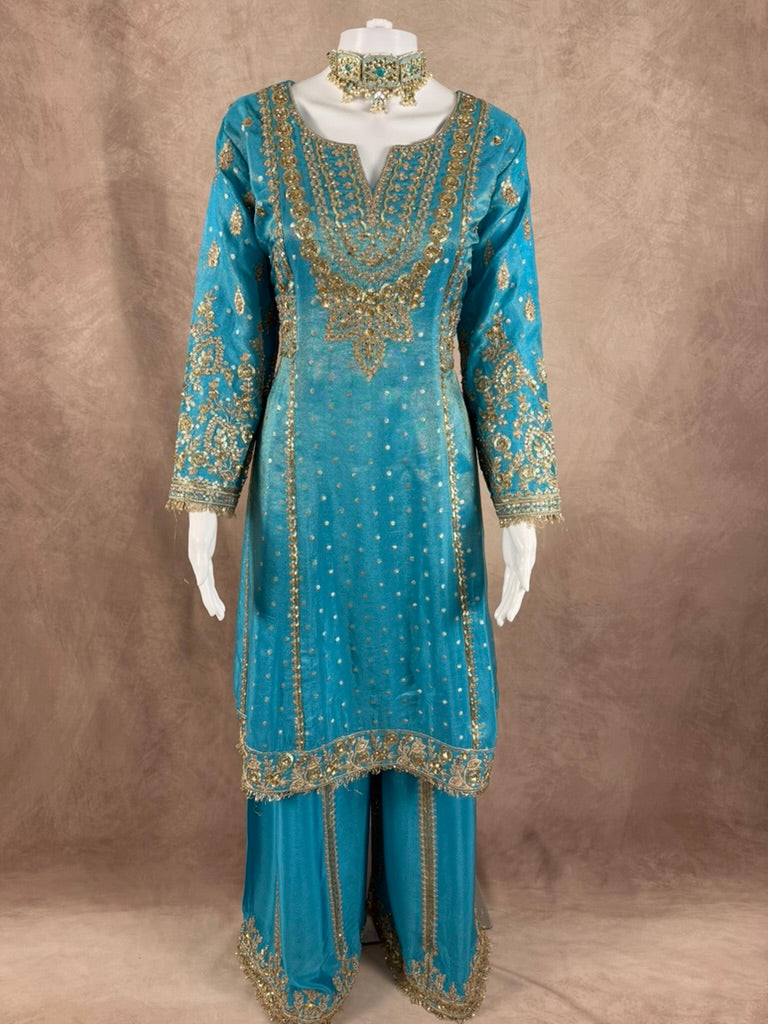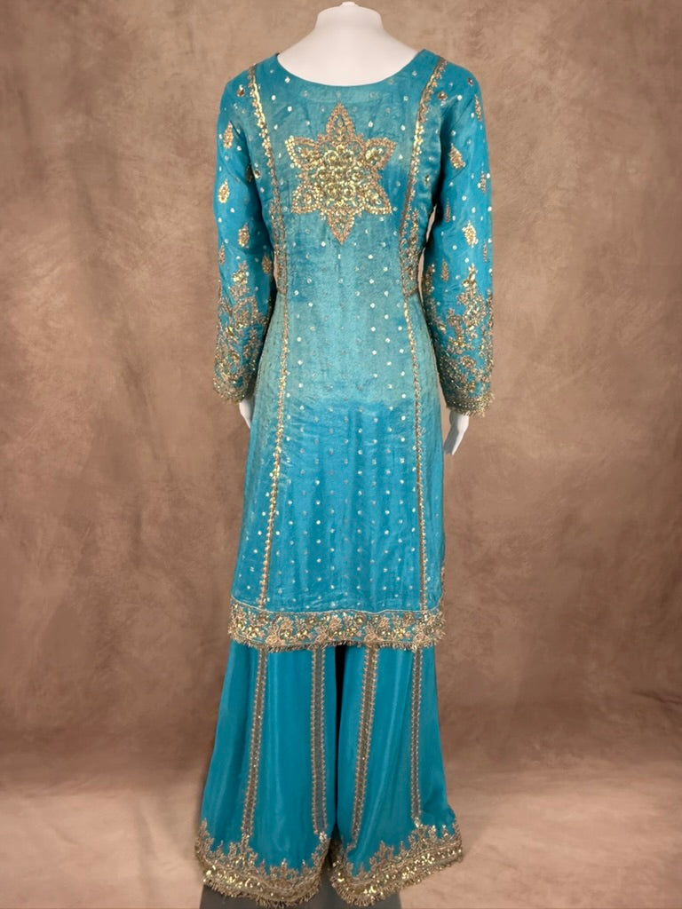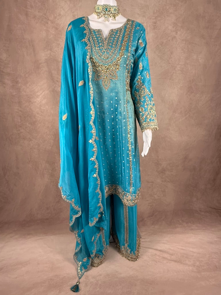 Radiate regal charm in this stunning Ocean Blue Sharara Set, a perfect blend of tradition and elegance. The outfit features a rich teal hue that beautifully complements its intricate gold embroidery.