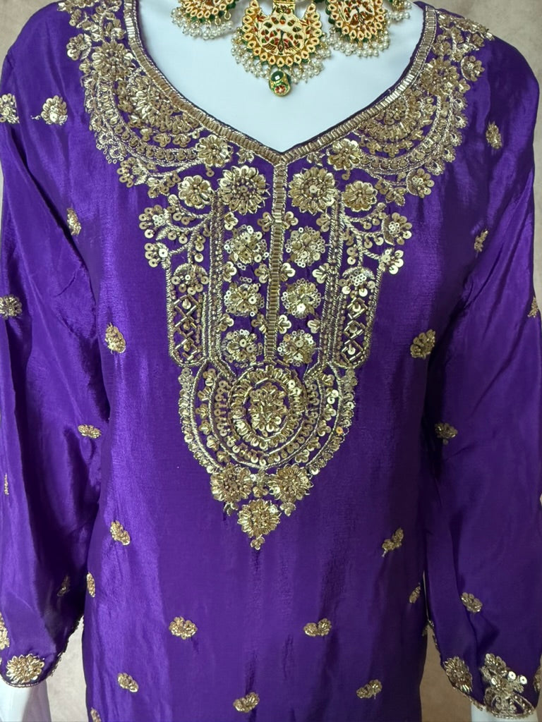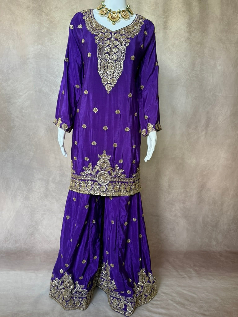Step into regal elegance with this stunning royal purple three-piece sharara suit — a perfect blend of traditional craftsmanship and rich color.