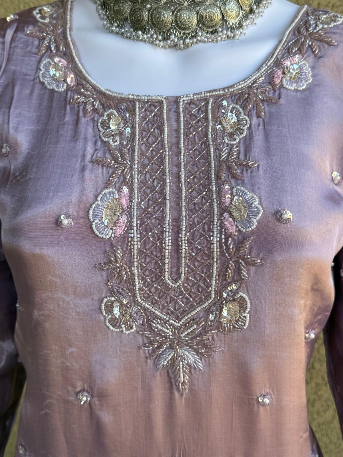Shirt: Straight-cut kurta. The neckline, hem, and sleeves are adorned with intricate embroidery.